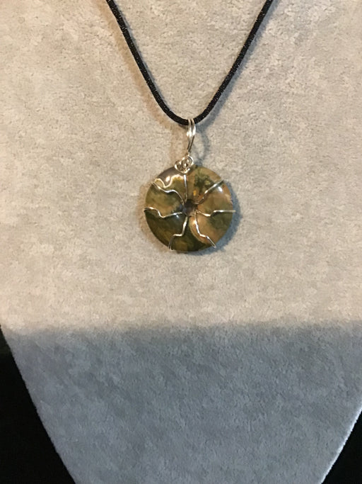 WM Unique DesignsBeautiful wire wrapped Moss Agate gemstone donut on a black satin cord with a silver extender chain and lobster clasp making it easily adjustable,
