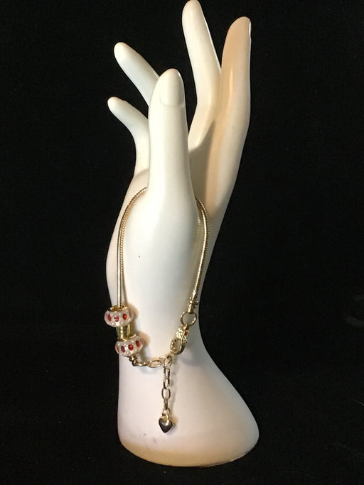 WM Unique DesignsBeautiful gold adjustable snake bracelet with milky white beads with red crystal dots in them with a June zodiac bead in the center.