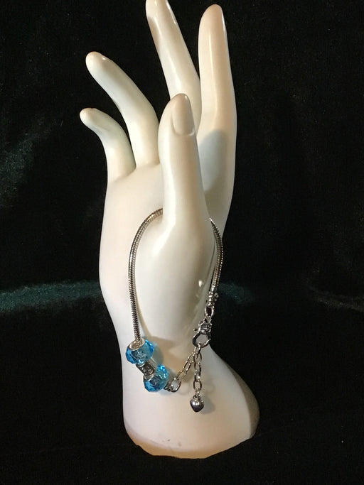 WM Unique DesignsBeautiful silver adjustable snake bracelet with aqua faceted glass beads and a Scorpio zodiac bead in the center,