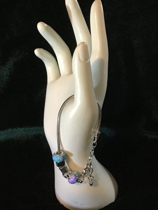 WM Unique DesignsBeautiful silver adjustable snake bracelet with opaque lavender bead light lavender faceted bead, pink faceted glass bead, a textured silver bead w...