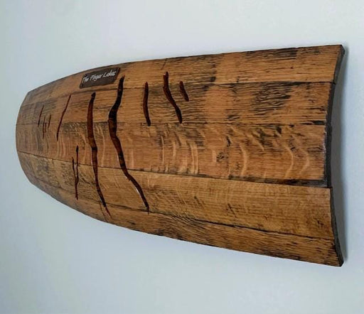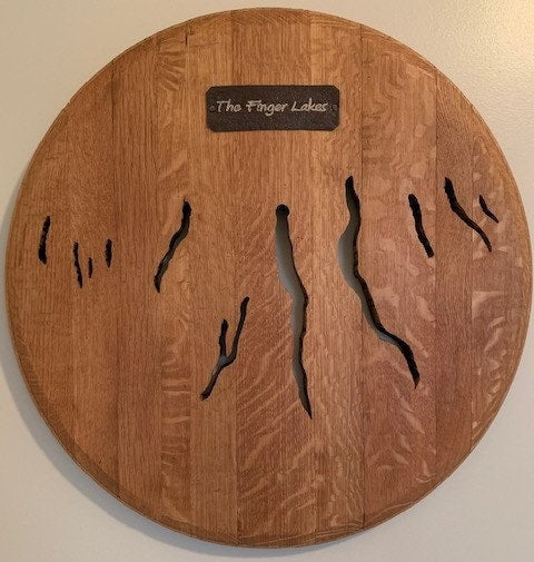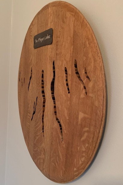 The iconic map of the Finger Lakes has been carved out of an oak barrel head to create a rustic wall hanging. A plaque displaying "The Finger Lake...