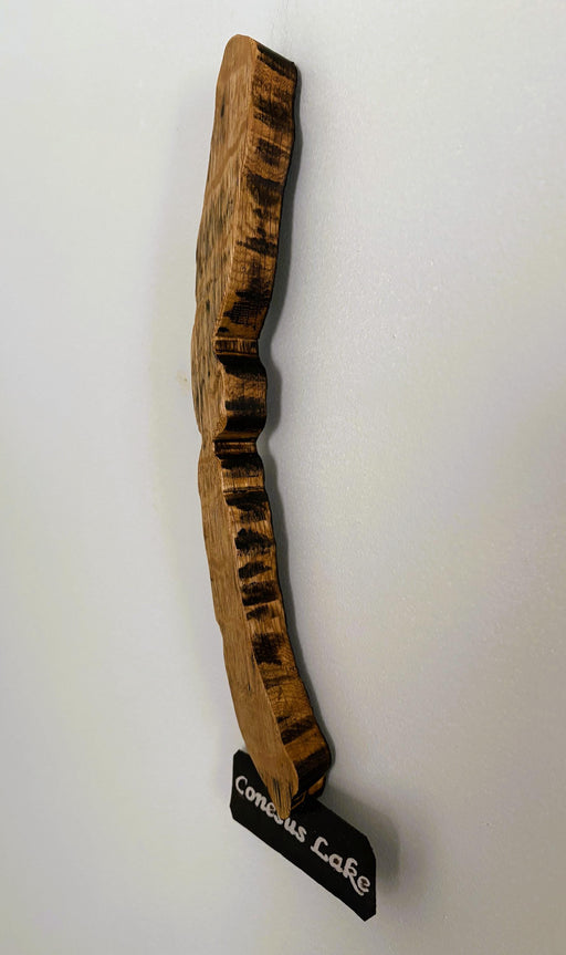 The shape of Conesus Lake has been carved out of oak barrel staves to create a rustic wall hanging. A rustic plaque has been attached displaying "C...