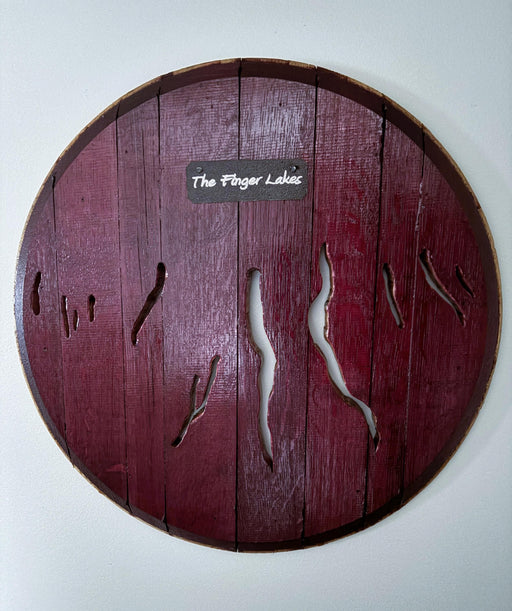 The iconic map of the Finger Lakes has been carved out of an oak barrel head to create a rustic wall hanging. The inside "red wine stained" surface...
