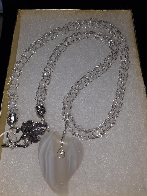 WM Unique DesignsWhite onyx heart pendant hangs from a hand woven silverplate chain consisting of 21 ft of wire with 200 plus iridescent crystals individually woven...