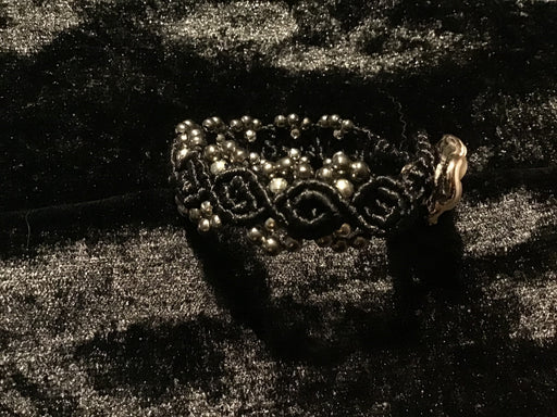 WM Unique DesignsHandmade black macramé rose bracelet with stainless embellishments and ceramic rose clasp.