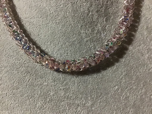 WM Unique DesignsHand woven chain consists of 21 ft. of silverplate wire with approx. 200 light pink and silver grey faceted crystals individually woven into chain....