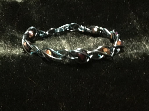 WM Unique DesignsBeautiful, twisted wire cuff made with burgundy and gold wire with clear faceted crystals.