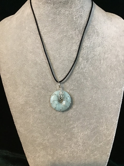 WM Unique DesignsBeautiful wire wrapped donut of light blue Sea Sediment Jasper on a black satin cord with silver extender chain and lobster clasp making it easily ...