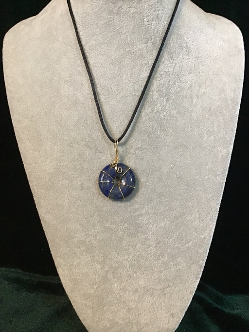 WM Unique DesignsBeautiful wire wrapped Lapis Lazuli gemstone donut on a black satin cord with silver extender chain and lobster clasp making it easily adjustable.