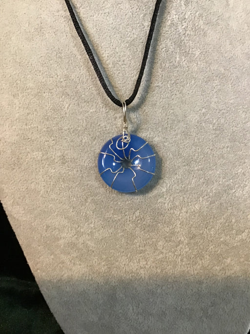 WM Unique DesignsBeautiful Blue Agate wire wrapped donut on a black satin cord with silver extender chain and lobster clasp making it easily adjustable.