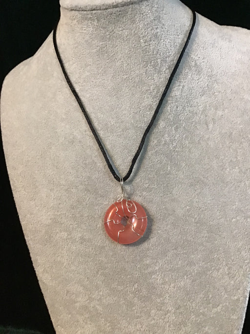 WM Unique DesignsBeautiful wire wrapped Cherry Quartz donut on a black satin cord with a silver chain and lobster clasp making it easily adjustable.