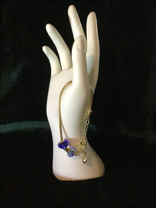 WM Unique DesignsBeautiful gold adjustable snake bracelet with light blue and cobalt blue faceted glass beads with an August zodiac bead in the center.