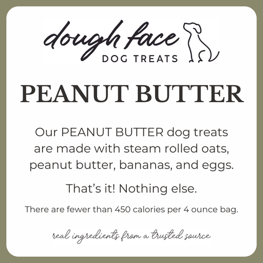 Dough Face Dog TreatsA simple, everyday treat made with real ingredients you can feel good about. Our PEANUT BUTTER Dog Treats are oven-baked in small batches using jus...
