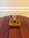 This unique table lamp is fashioned from an upcycled oak barrel stave for the base, a barrel hoop formed into a spiral globe, and a cut wine bottle which fits over the decorative light source. The light fixture with a 6' cord and switch is included. Two color options are available: tinted wine bottle with brown hoop globe and clear wine bottle with silver hoop globe. This would be a conversation piece for and home, cottage or business.