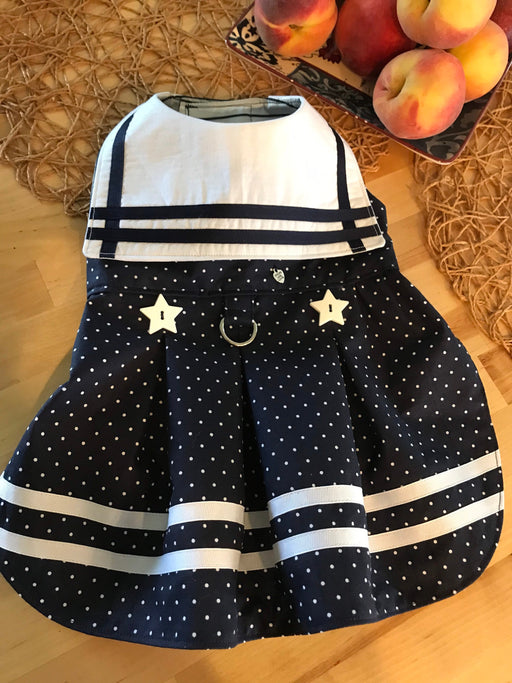 Fetching Dog FashionsWelcome aboard a little sailor in this striking nautical style frock! She’s turning heads and ready to sail quickly into your hearts. Navy and whit...