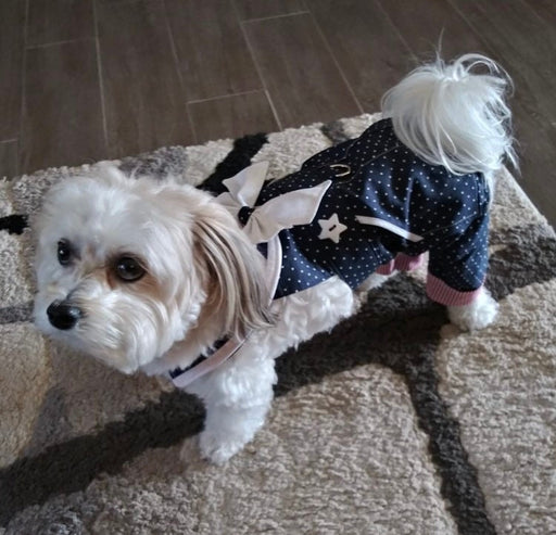 Fetching Dog FashionsWelcome aboard a little sailor in this striking nautical style frock! She’s turning heads and ready to sail quickly into your hearts. Navy and whit...