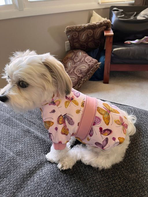 Fetching Dog FashionsWelcome Spring and Summer in this perky knit shirt! Stretchy knit butterfly fabric has a contrasting solid pink knit belt and cuffs. Comfy, easy to...