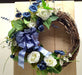 Beautiful 14-inch grapevine wreath with white roses and miniature blue roses accented with blue satin ribbon.