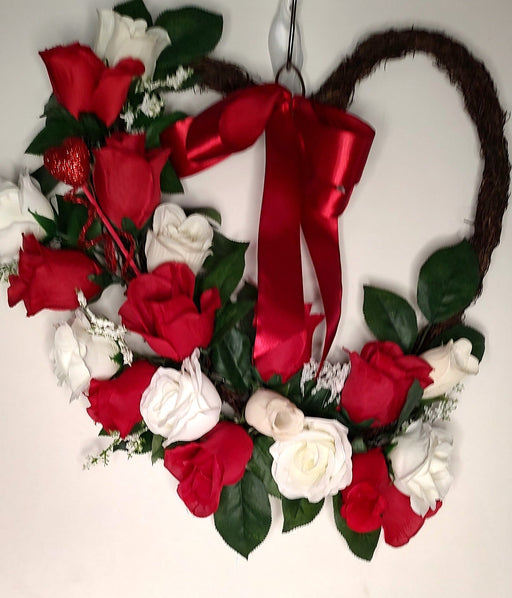 Silk SensationsBeautiful heart-shaped grapevine wreath adorned with red and white roses and baby breath flowers. Would make a perfect Valentine wreath for your fr...
