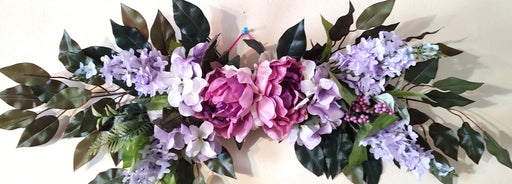 Silk SensationsDecorative wall swag adorned with white wisteria flowers, dark red roses, and purple flowers.