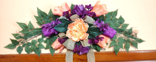 Silk SensationsPretty Spring wall swag decorated with coral and purple tulips and complimented with burlap bow.