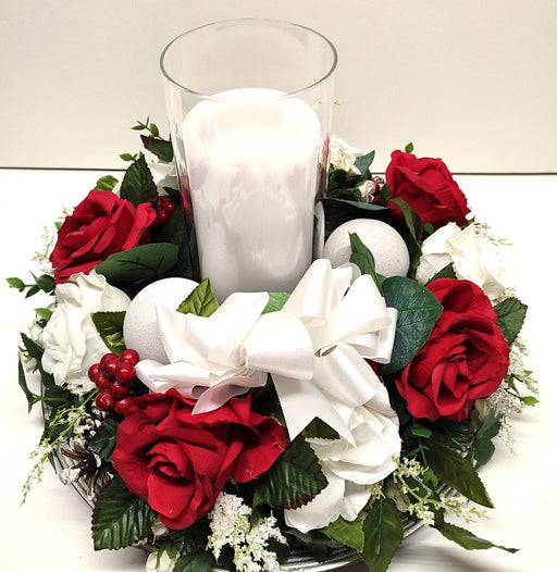 Silk SensationsBeautiful Valentine floral table arrangement with red and white roses and baby breath. Candle is battery operated for safety.