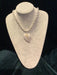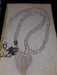 White onyx heart pendant hangs from a hand woven silverplate chain consisting of 21 ft of wire with 200 plus iridescent crystals individually woven into chain. approx. 20-21 inches long with Tibetan silver toggle clasp.
