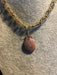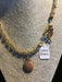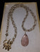 Hand woven chain consists of 21ft. of champagne colored silver plate wire with approx. 200 iridescent copper faceted glass crystals individually woven into chain. The teardrop shaped pendant is Coral Fossil Hand carved from Bali, Indonesia. Toggle is gold colored Tibetan Silver flower.
