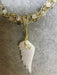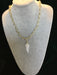 Hand woven chain consists of 21ft. f champagne colored silverplate wire with approx. 200 metallic gold and white facet glass crystals individually woven int chain. Pendant is a hand carved crescent moon of Dendrite chosen by me from Bali, Indonesia. Gold colored Tibetan grape leaf toggle finishes this piece,