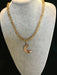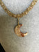 Hand woven chain consists of 21 ft. of gold colored silverplate wire with approx. 200 champagne iridescent faceted glass crystals individually woven into chain Pendant is crescent moon hand carved Lace Agate from Bali. Indonesia.