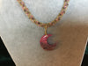 Hand woven chain consists of 21ft of gold colored silverplate wire with approx. 200 pale pink and purple faceted glass crystals individually woven into chain. Gemstone crescent moon pendant is hand carved Lace Agate. Gold colored Tibetan Silver flower toggle completes the piece.