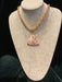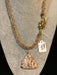 Hand woven chain with approx. 200 iridescent peach and champagne colored faceted glass crystals individually woven into chain. Gemstone pendant is Plume Agate. Gold colored Tibetan Silver flower toggle.
