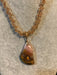 Hand woven chain with approx. 200 peach colored faceted glass crystals individually woven into chain. Gemstone pendant is Agate. Gold colored Tibetan silver grape leaf toggle.