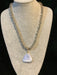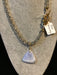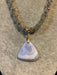 Hand woven chain consists of 21ft, of gold colored silver plate wire with approx., 200 pale blue and metallic silver faceted crystals individually woven into chain. Gemstone pendant is Blue Chalcedony. Gold colored Tibetan silver flower toggle.