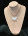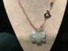 Hand woven chain consists of 21ft, of rose gold colored silverplate wire with approx100 white faceted glass crystals. Gemstone Opalite hand carved flower pendant. Tibetan silver toggle.