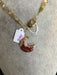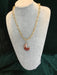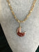 Hand woven gold chain composed of 21ft of silverplate wire with 250 peachy cream and peach faceted crystals with a peach and rust colored agate crescent moon pendant hand carved from Bali, Indonesia.