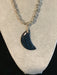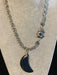 Beautiful hand-woven chain consisting of 21ft of silverplate wire with 250 iridescent light blue faceted glass crystals individually hand woven into chain. The pendant is a Black onyx with blue stripes crescent moon.
