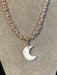 Beautiful hand-woven chain consisting of 21ft of rose gold colored silverplate wire with 250 milky white faceted glass crystal glass beads, beautiful hand carver crescent moon is Opalite from Bali, Indonesia. Tibetan silver flower toggle clasp.