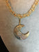 Beautiful hand-woven chain consisting of 21ft of gold colored silverplate wire with 250 peachy orange iridescent faceted glass crystals individually woven into chain. The pendant is a hand carved crescent moon of Lace Agate from Bali, Indonesia. the toggle is a gold Tibetan silver flower clasp.