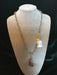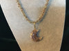 Beautiful hand-woven chain consisting of 21ft of gold colored silverplate wire with 250 copper colored faceted crystals individually woven into chi. the pendant is a hand carved crescent moon of Lace Agate from Bali., Indonesia. The toggle is a gold-colored Tibetan silver flower clasp.
