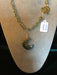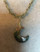 Beautiful hand-woven chain consisting of 21ft f champagne colored silverplate wire with 250 pale green iridescent faceted glass crystals. The pendant is a hand carved crescent moon of Moss Agate from Bali, Indonesia. The toggle is a gold-colored Tibetan silver flower clasp.