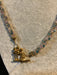 Hand woven chain consists of 21 ft. of champagne colored silver plate wire with 200 light lavender, light green, and lavender faceted glass crystals individually woven into chain. Gold colored Tibetan Silver flower toggle.