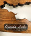 The shape of Oneida Lake has been carved out of oak barrel staves to create a rustic wall hanging. A weathered, metal plaque displaying "Oneida Lake", is attached to the top surface. The wood is protected with a polyurethane coating. In addition, wires have been attached to the back for easy hanging. This is a unique piece of wall art that would be an attractive decoration in many rooms in your home or cottage.