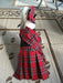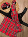The bodice fabric is black faux suede, pleated skirt tartan poly-blend plaid, with matching sash. Decorative pins accent the Hat and sash. The hat has an elastic band under the chin. The kilt has Hook and loop closures at the neck and chest.